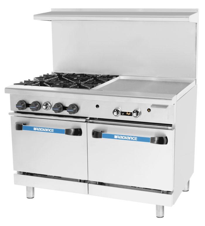 Key Features Radiance Restaurant Range, 48″W, (6) 32,000 BTU Open Burners, 12″ Griddle (left side),...