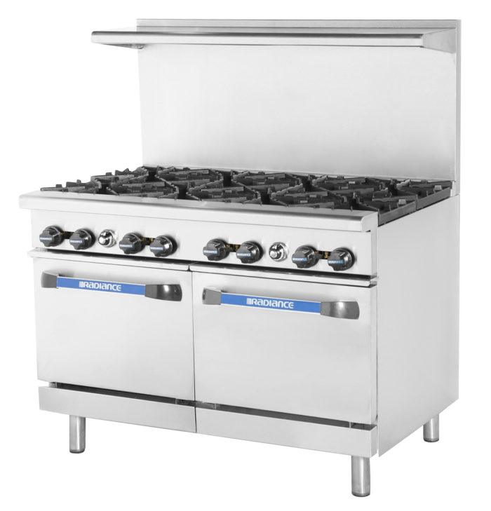 Radiance Restaurant Range, 48″W, (8) 32,000 BTU/hr each lift-off top Open Burners, 2 standard oven w/(1) rack, Stainless steel ext. at front, sides & back riser lift-off high shelf, Full stainless steel oven interior, Adjustable oven thermostat, 26.3″ Depth standard, 6″ stainless steel adjustable legs standard, Regulator included, 326,000 BTU total
