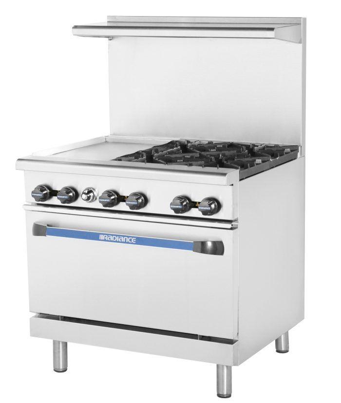Radiance Restaurant Range, 36″W, (4) 32,000 BTU Open Burners, 12″ Griddle (left side), 1 standard oven w/(1) rack, Stainless steel ext. at front, sides & back riser lift-off high shelf, Full stainless steel oven interior, Adjustable oven thermostat, 26.3″ Depth standard, 6″ stainless steel adjustable legs standard, Regulator included, 178,000 BTU total